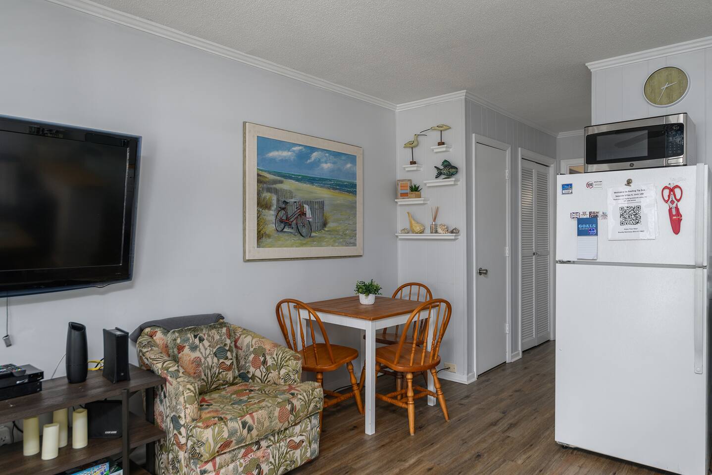 Our compact yet well-appointed kitchenette is fully stocked with an oven, range, Keurig coffeemaker, and blender, ensuring your mornings begin on the right note. Retreat to the tranquility of a plush queen-sized bed and a full bath, creating the perfect oasis for couples seeking a laid-back getaway. Leave your worries behind and let us take care of your beach essentials, from chairs to a handy beach wagon for effortless transportation. Located directly on the beach, our condo complex, Seaside Villas II offers the ultimate in convenience. Whether you're returning for a quick bathroom break, indulging in BBQ lunches at the communal grill area, or seeking refuge from the sun in the cool comfort of air conditioning, everything is just steps away. Your idyllic beach escape awaits at Feeling Tip Sea.